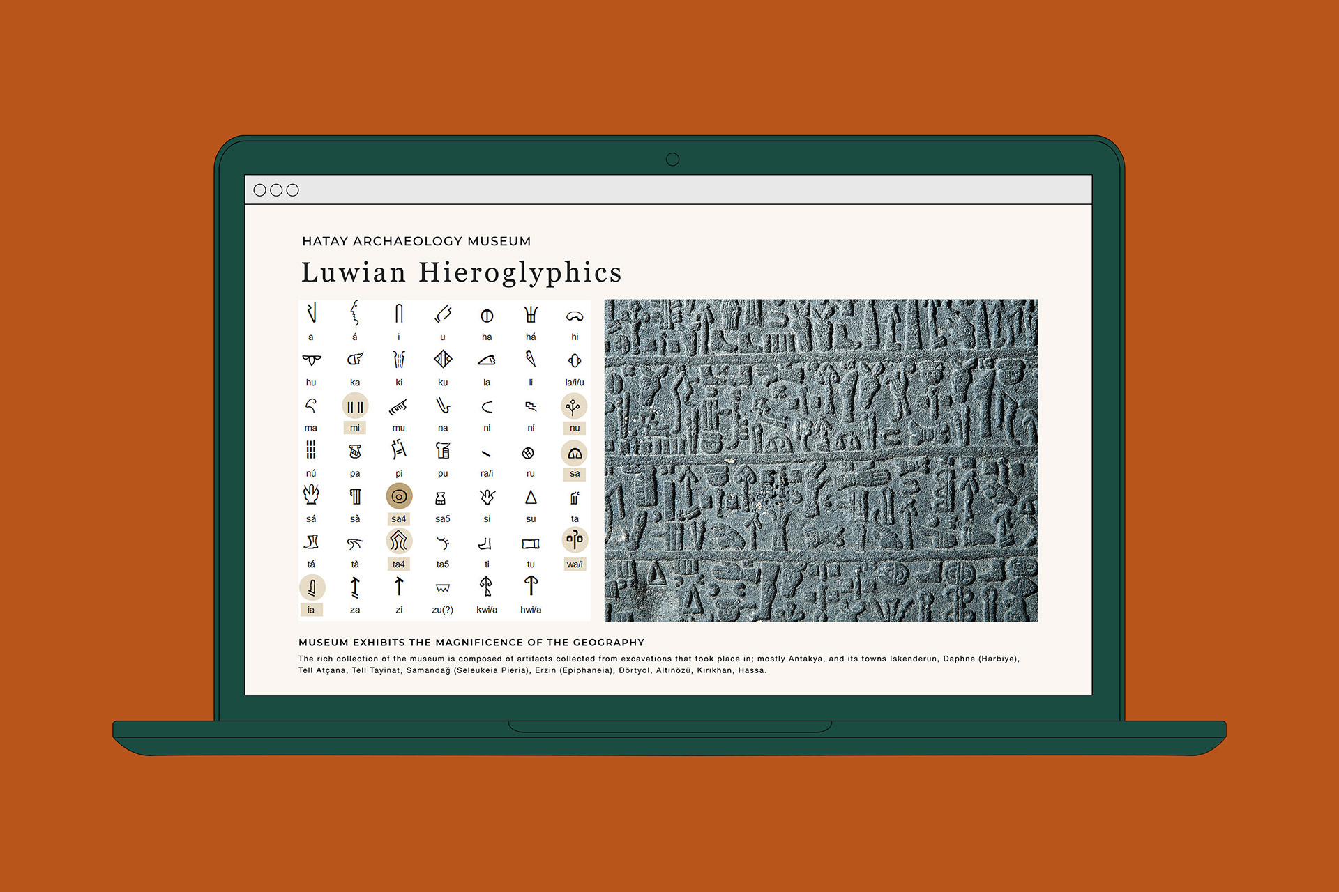 Among the inscriptions found in the Hatay Archeology Museum is the Luwian hieroglyph, a writing system unique to Anatolia that was born from symbols and pictograms that were widely used in the second millennium BC. It is thought that the Luwian hieroglyph was used in Anatolia for about 700 years.