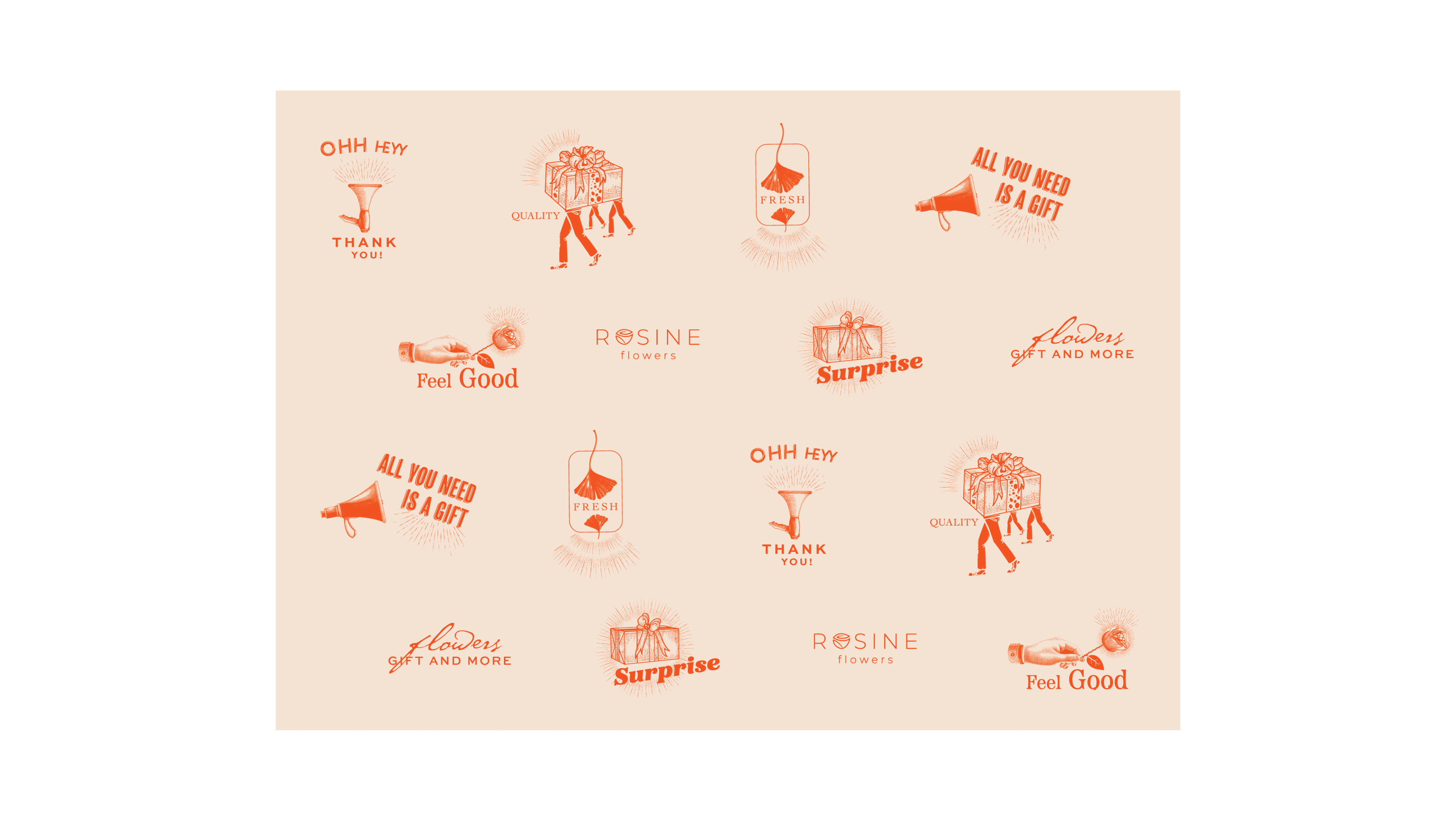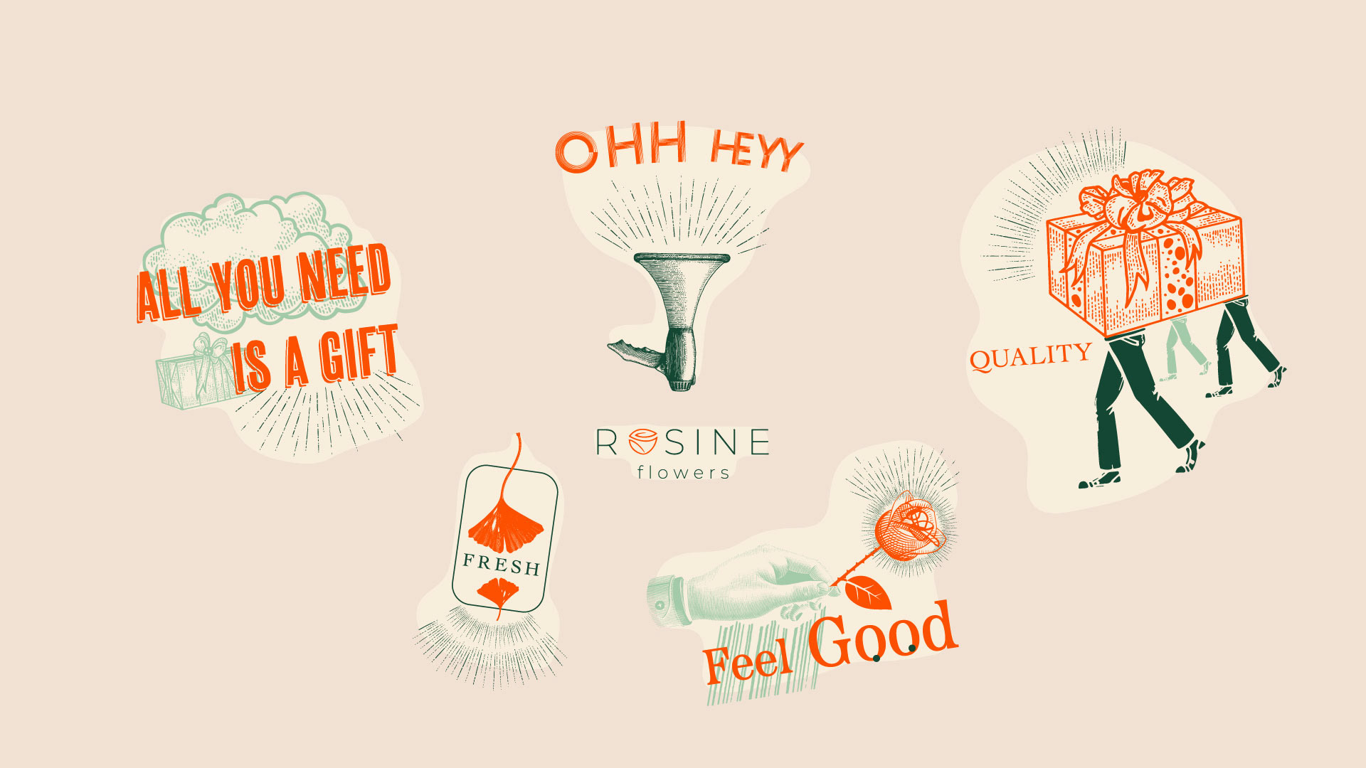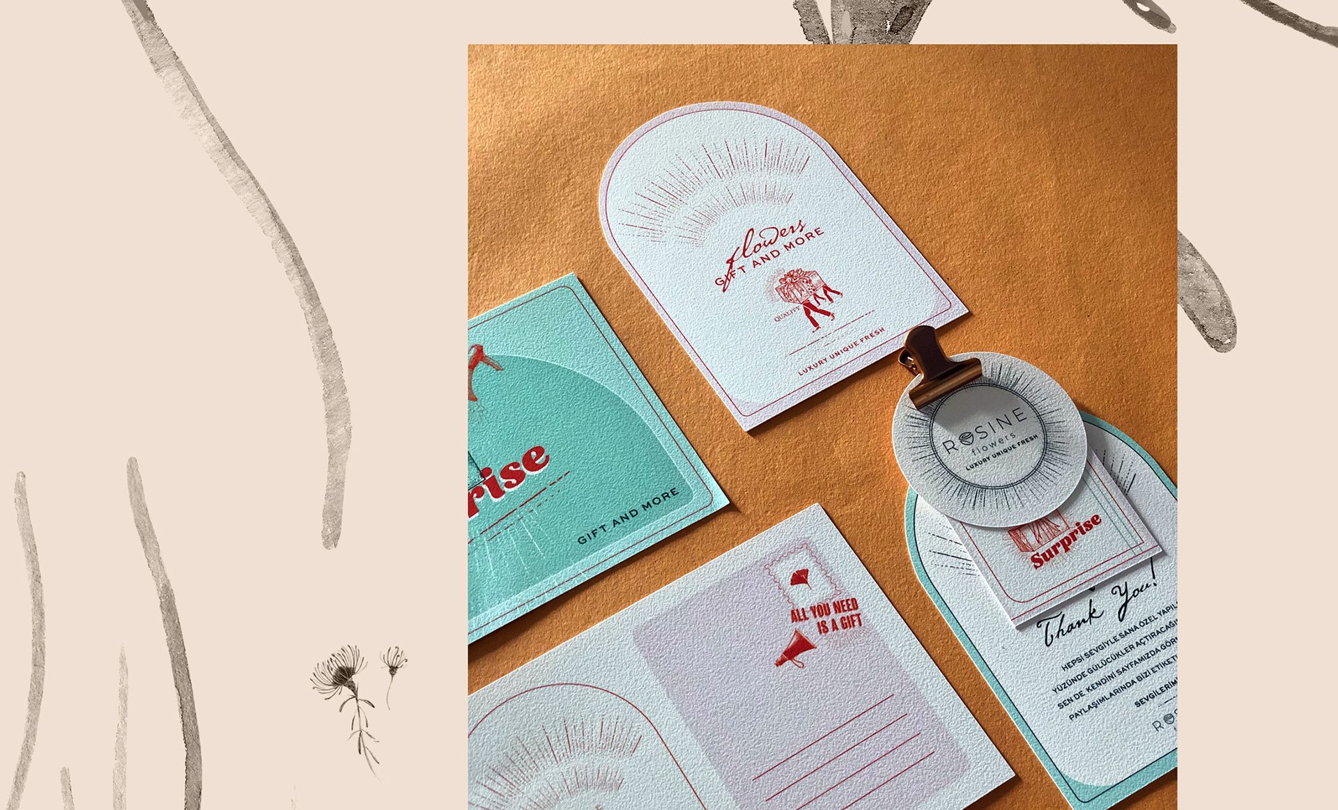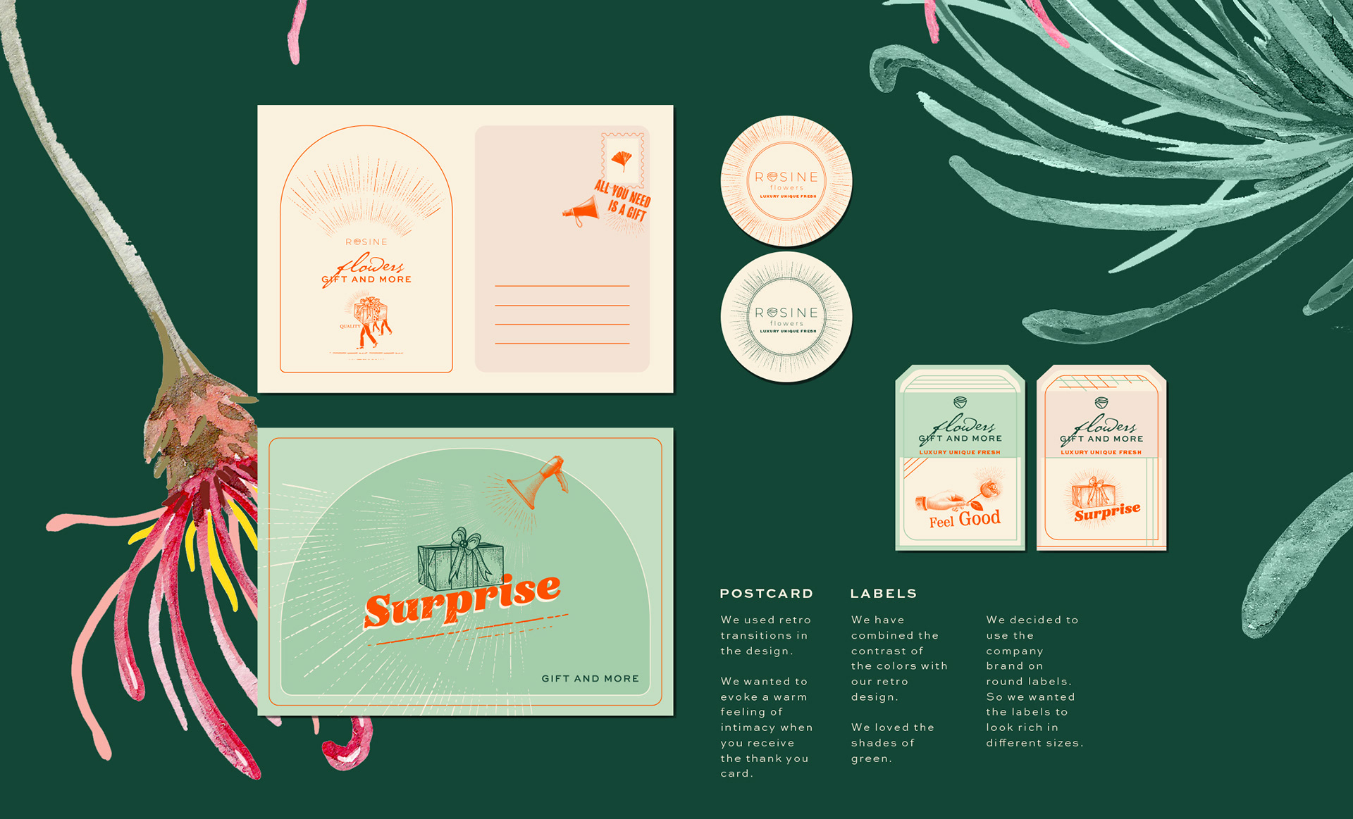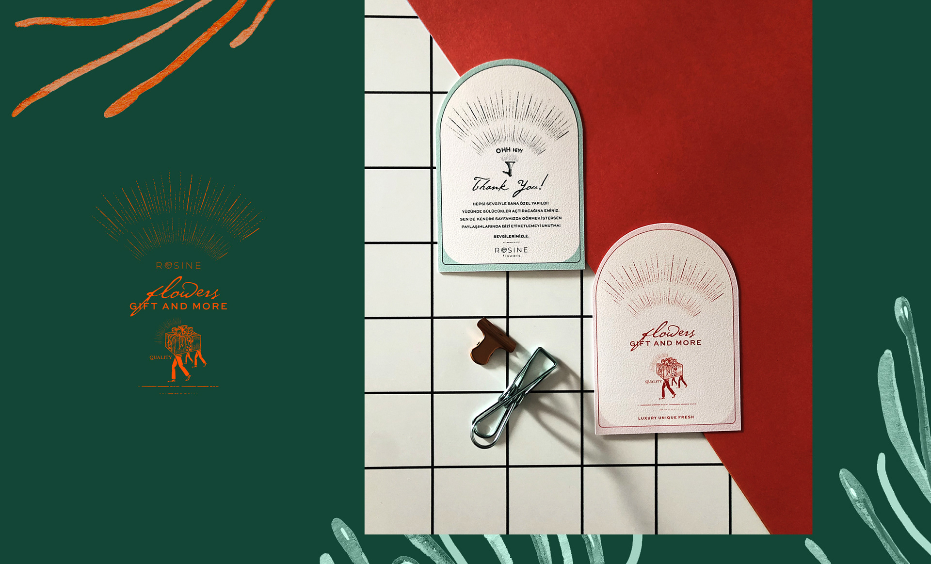 We redesigned Rosine Flowers brand. In addition to the logo, we designed corporate packaging, cards, labels and coasters. We combined fun, quality and nostalgia to revitalize.