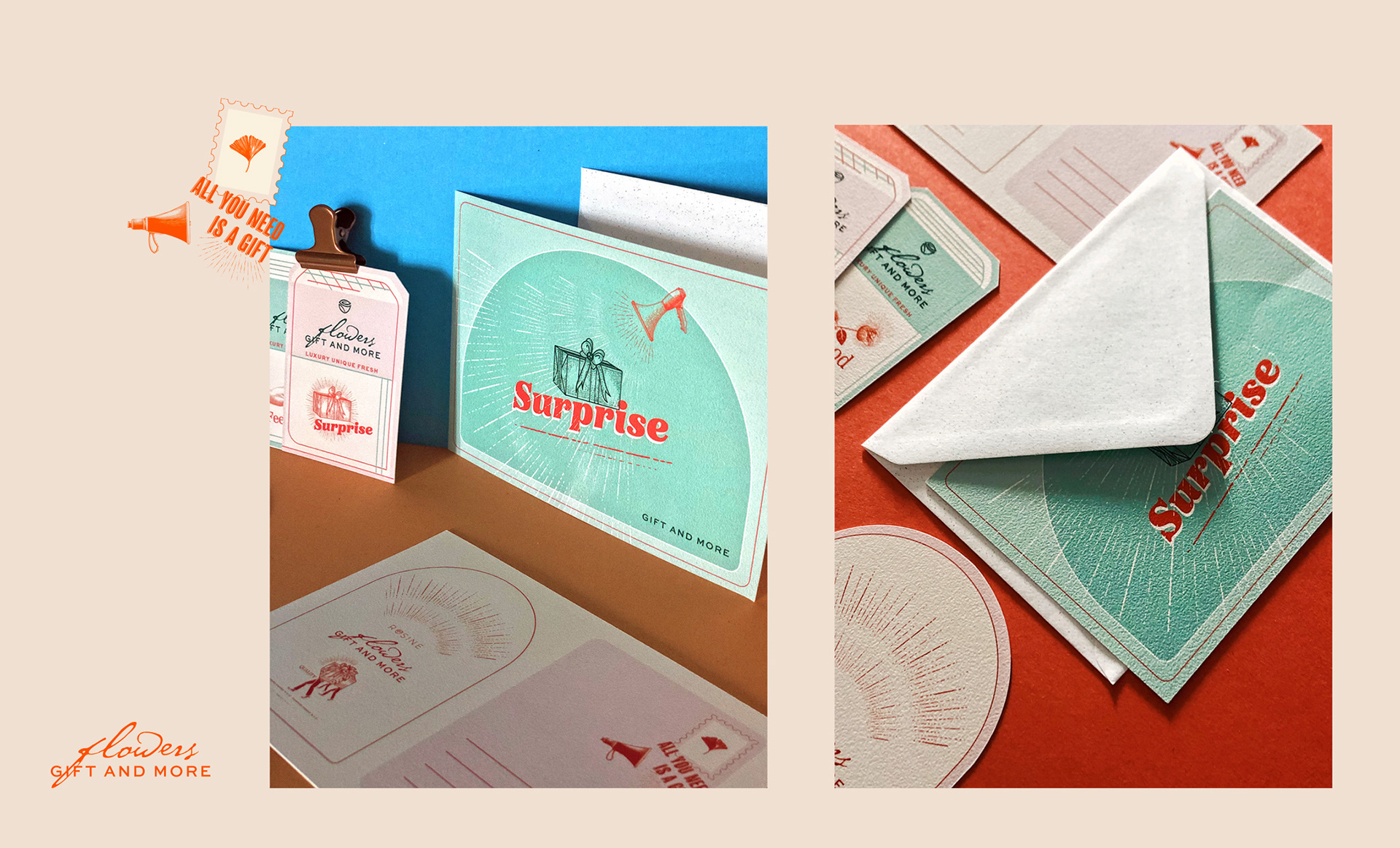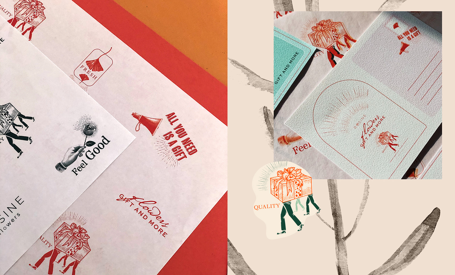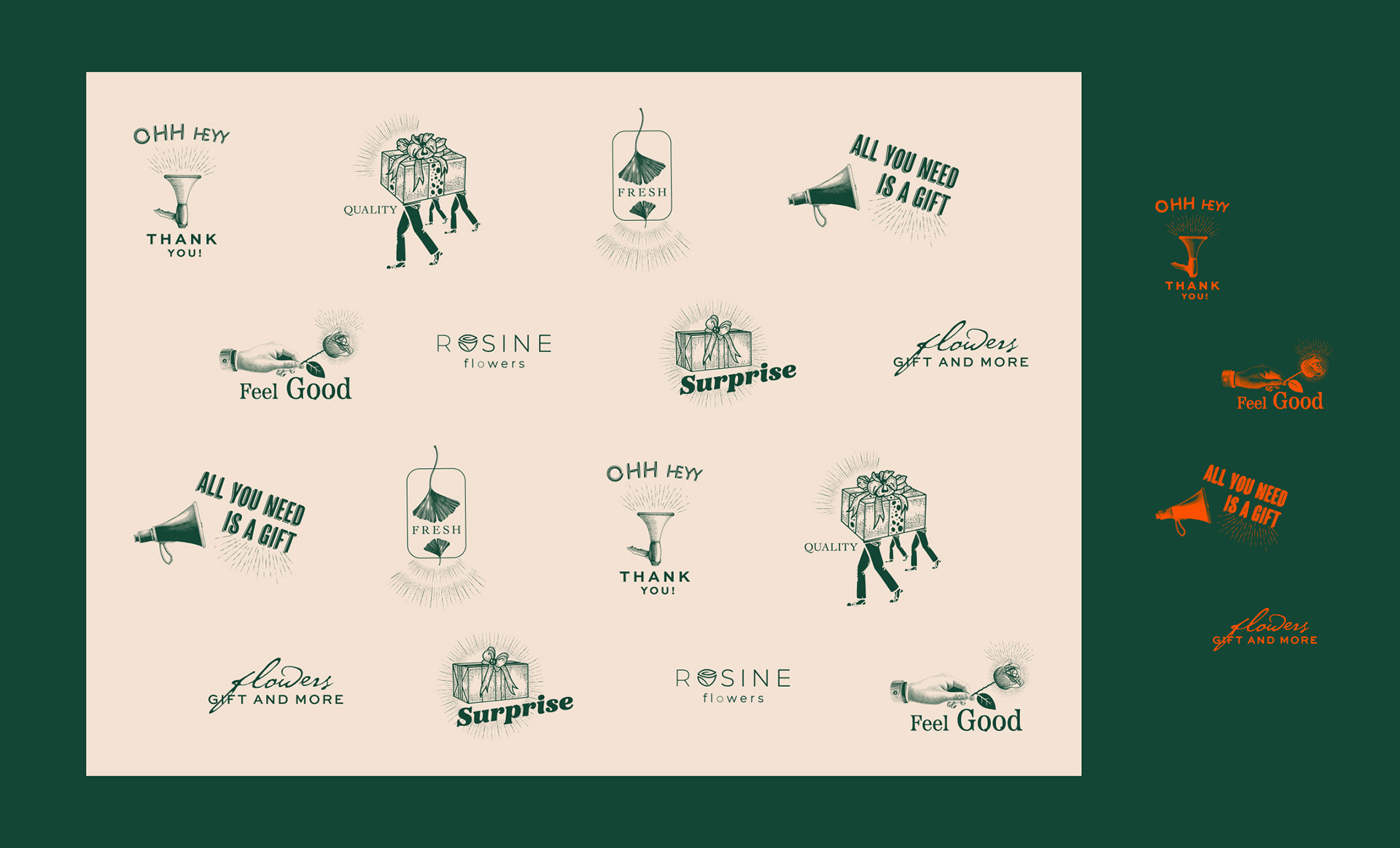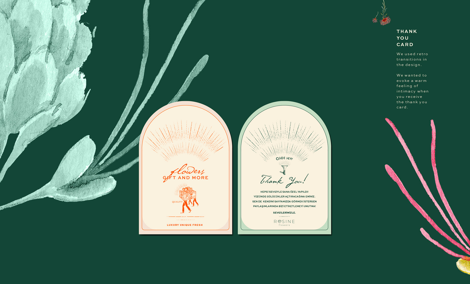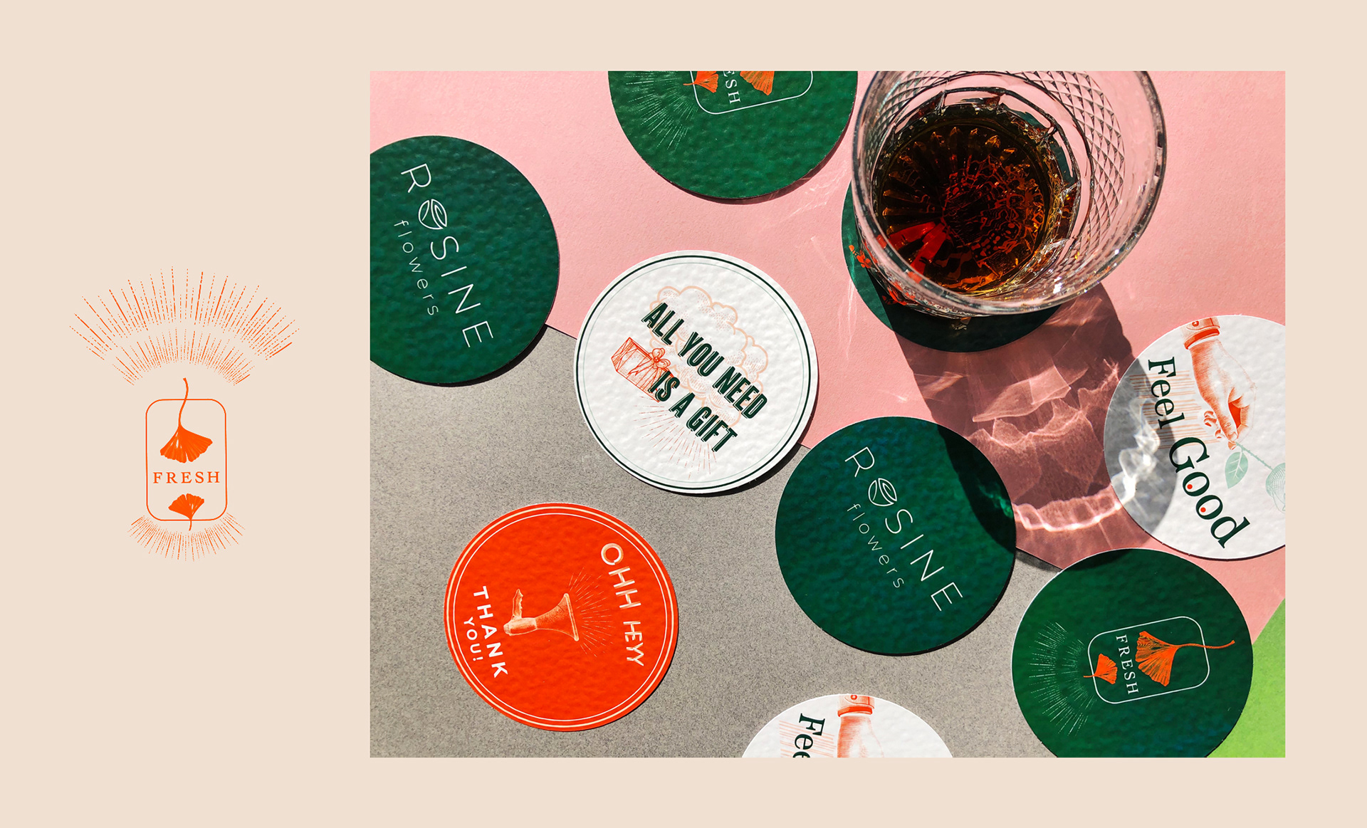We redesigned Rosine Flowers brand. In addition to the logo, we designed corporate packaging, cards, labels and coasters. We combined fun, quality and nostalgia to revitalize.